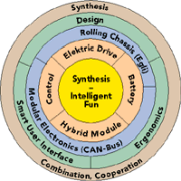 The hybrid electric motorcycle is not an "invention" like the light bulb: no single component is something entirely new. However, the project is an invention - or as we would say, synthesis - because it combines parts that are available for some time in a new and elegant way. The special focus lies on efficent cooperation of various factors beyond technology issues alone.